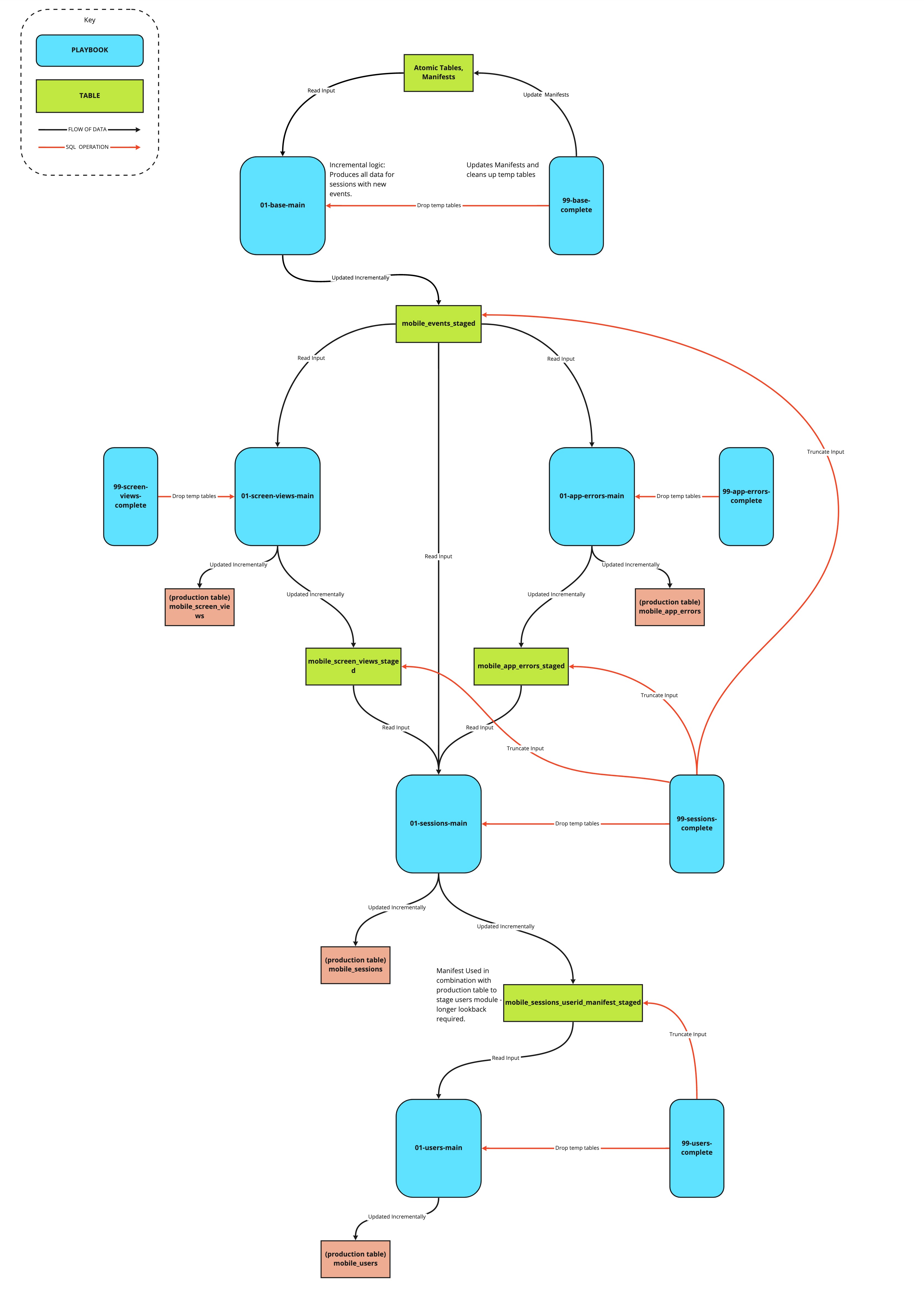 Each module produces a table which acts as the input to the subsequent module (the _staged tables), and updates a production table – with the exception of the base module, which takes atomic data as its input, and does not update a production table.
