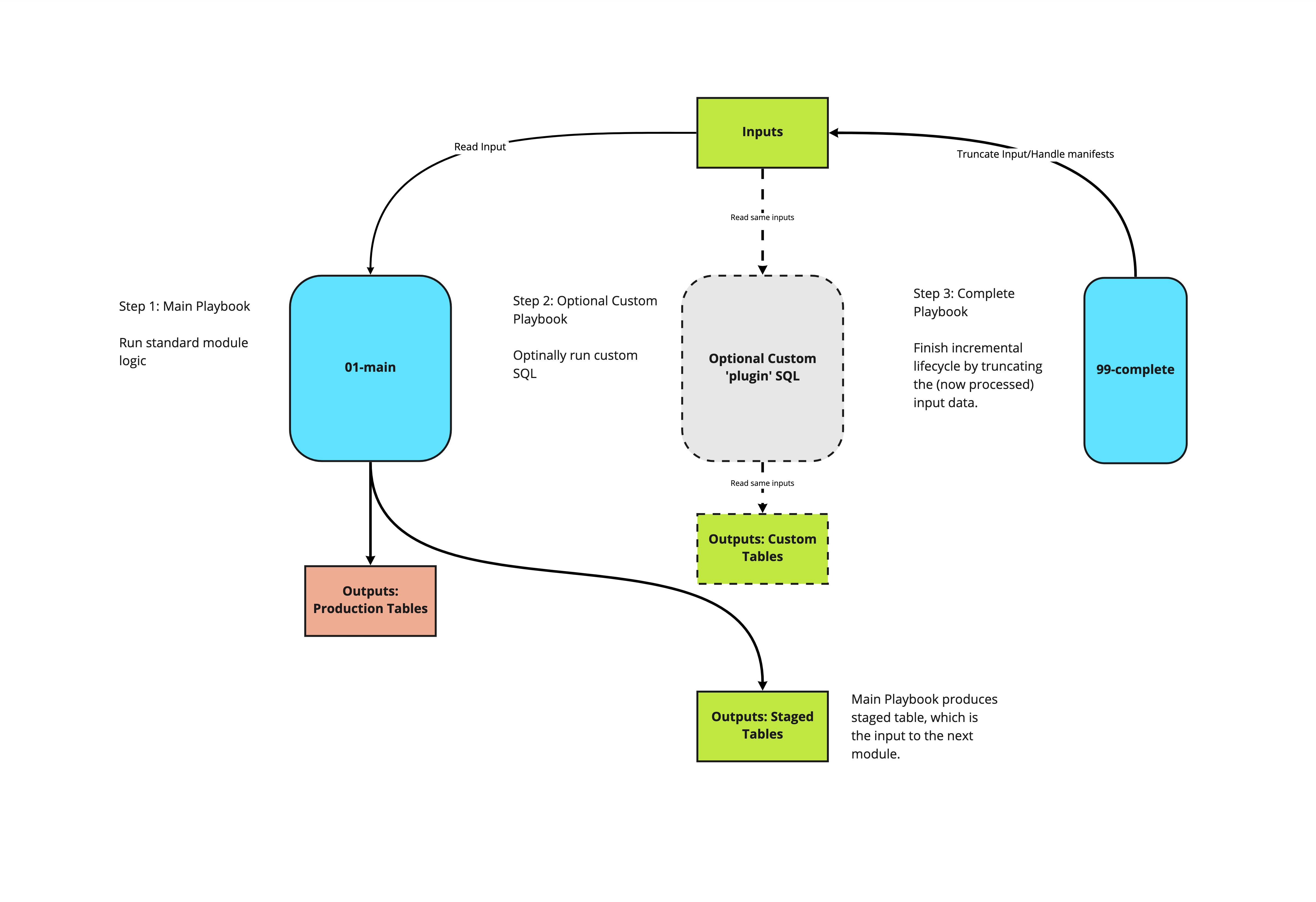 Custom modules can fit into the incremental structure by consuming the same inputs, and running before the 99-{module}-complete playbook runs. Custom modules may also consume and intermediary tables of the standard module, which will not be dropped until the 99-{module}-complete playbook runs.