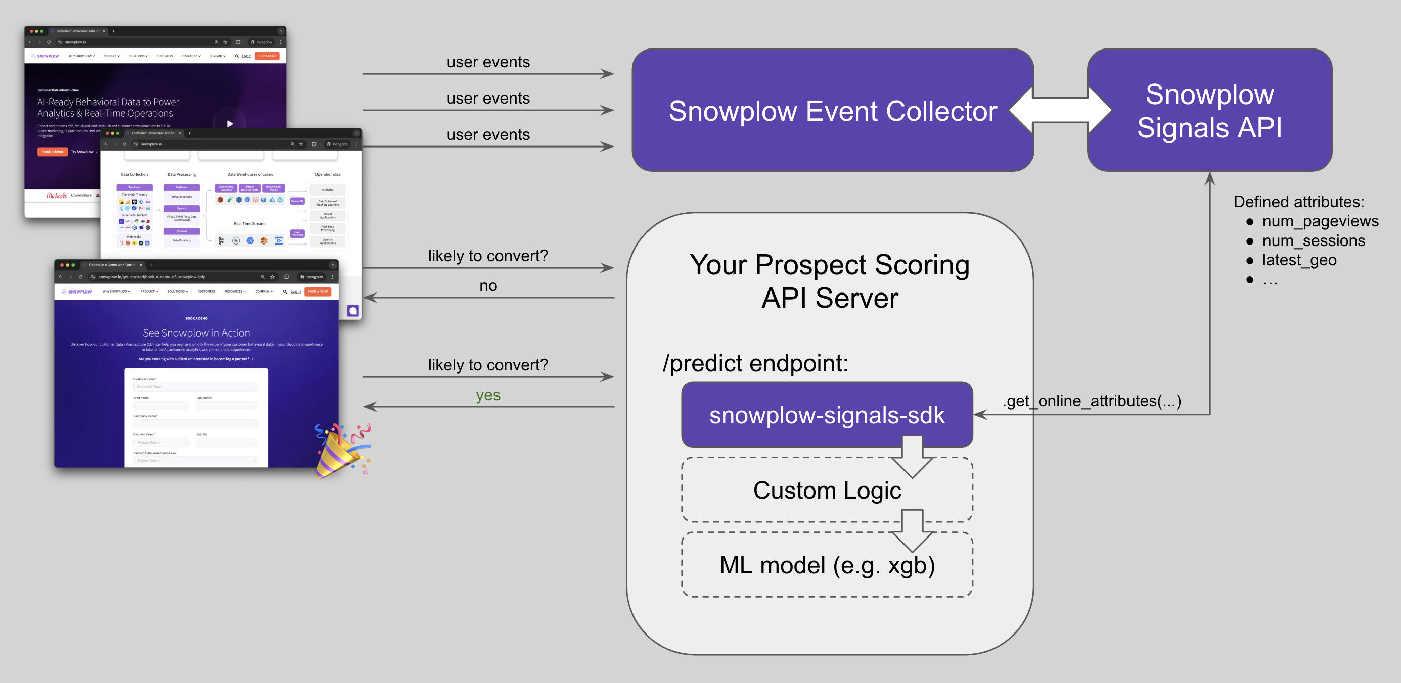 This guide will through the process of building a real-time prospect scoring system using Signals together with a machine learning model. You'll learn how to leverage Snowplow event data to predict a prospect's likelihood to convert on your website, and how to trigger personalized engagements.